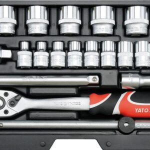 Gola sada 3/8" obsahuje nástavce, prodlužovací nástavce, kloubové nástavce, ráčnu s plastovou rukojetí a t-vratidlo. Vyrobené z kvalitní chromvanadiové oceli...