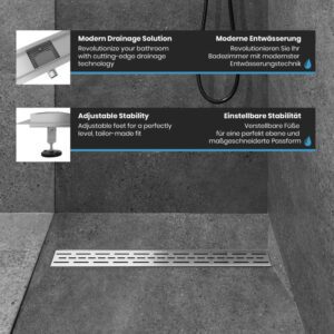 Proměňte svou koupelnu v oázu stylu a inovací díky našim vynikajícím lineárním sprchovým odtokům. Nerezová ocel nejvyšší kvality, umně kartáčovaná, v kombinaci s pískovaným hlavním tělem. Design vaší koupelny si zaslouží něco výjimečného, proto jsou naše sprchové odtoky navrženy tak, aby nejen zaujaly, ale také inspirovaly svou odolností. Díky zapuštěnému povrchovému materiálu vám zaručujeme výrobek, který obstojí ve zkoušce času. Instalace je rychlá, nekomplikovaná a bez nutnosti použití baterií. Mysleli jsme na vše, abyste se mohli bez obav soustředit na to podstatné. Vylepšete tvar a funkci svého sprchového koutu pomocí našeho elegantního a odolného lineárního sprchového odtoku, který dodá vaší každodenní rutině sofistikovanost.
