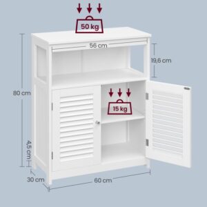 Vneste do své koupelny klid a styl s touto elegantní bílou skříňkou. Matný povrch, lamelová dvířka a jednoduchý design vytvářejí harmonický celek, který zútulní každé ráno i večer. Skříňka nabízí dostatek prostoru pro ručníky, kosmetiku i dekorace a přináší do vaší domácnosti pocit pořádku a pohody.