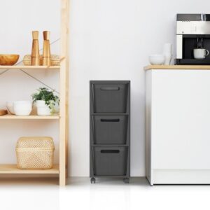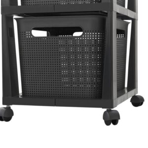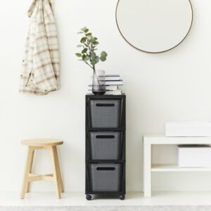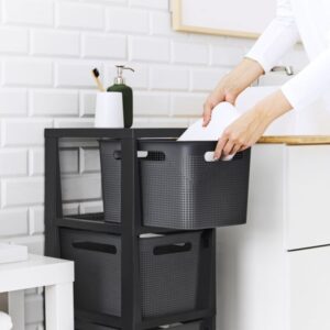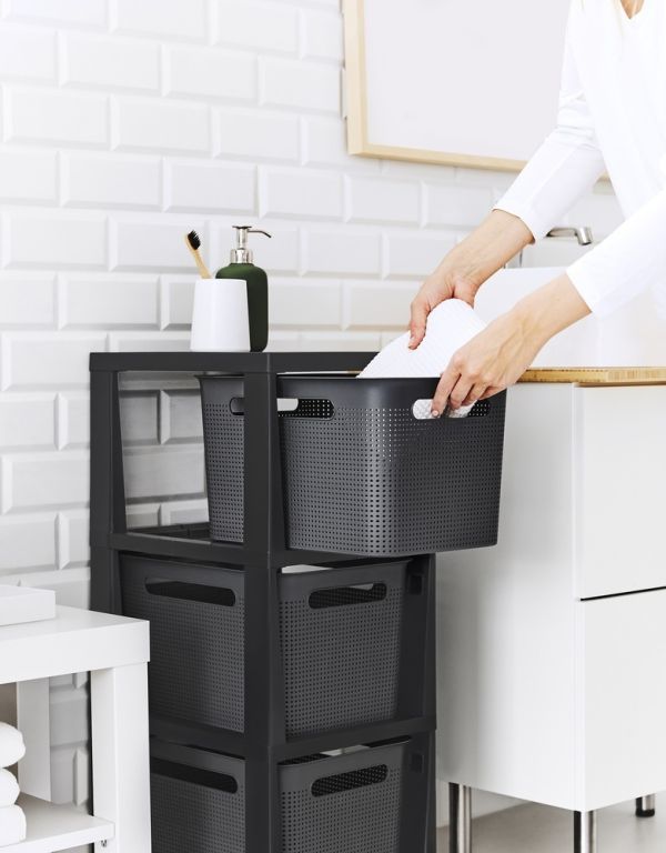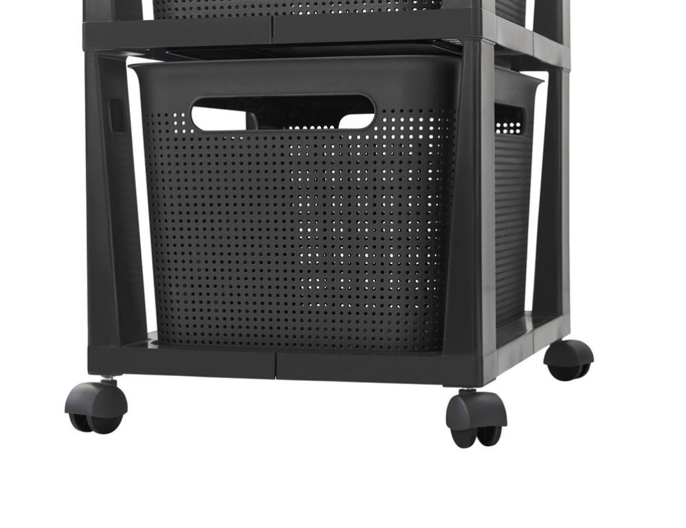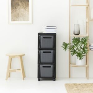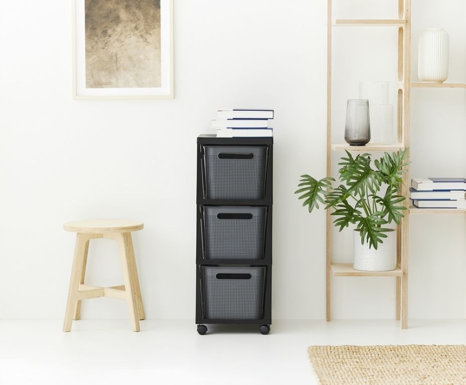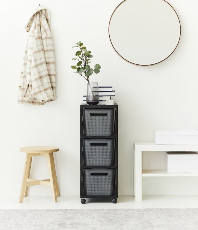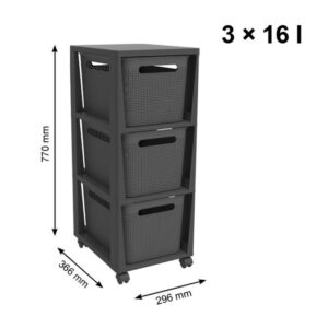 Plastový regál se třemi patry. Tři úložné boxy s děrovanou strukturou z kolekce Brisen. Boxy jsou ideální pro organizaci věcí. Objem boxu je 16 l. Kolečka pro jednodušší manipulaci. Moderní a kvalitní provedení od švýracské značky Rotho.
