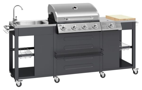 Zahradní kuchyně VICENZA nabízí vše potřebné pro zahradní grilování s přáteli. Je jedinečnou kombinací plynového grilu, dřezu s vodovodním kohoutkem, pracovní desky s masivním dřevěným prkénkem, plynového hořáku (vařiče) a odkládacích košů. Hlavní grilovací prostor je osazen 4x hořáky se samostatnou regulací a piezo zapalováním. Díky možnosti vypnout prostřední hořáky je gril vhodný jak pro přímé, tak pro nepřímé grilování, je vybaven teploměrem a odkládacím roštem pro udržování teplot již hotových pokrmů. Celá zahradní kuchyně je doplněna vařičem se samostatnou regulací a piezo zapalováním. Součástí je i spojovací hadice k plynové lahvi a redukční ventil. Systém Flame Tamer – přímo nad hořáky jsou umístěny kovové profily, které zabraňují skapávání tuku mezi plameny a jeho následné vzplanutí. Zároveň zabraňují přímému ohřevu mřížky plameny hořáku pouze v jeho místě, čímž dochází k výrazně rovnoměrnějšímu vyhřívání celé grilovací mřížky se smaltovanou povrchovou úpravou. Grill je opatřen poličkou ve spodní části celé plochy grilu, určenou pro odkapávající tuk. Polička se vysouvá v zadní časti, tím je docíleno snadného čištění grilu. Dřez spolu s vodovodním kohoutkem je výborným pomocníkem při grilování. Kohoutek lze snadno připojit např. na vodovodní hadici. Celá zahradní kuchyně je pojízdná (8 koleček z toho 4 bržděná), po stranách i zepředu je osazena odkládacími košíky a na bočních rukojetích i háčky pro zavěšení.