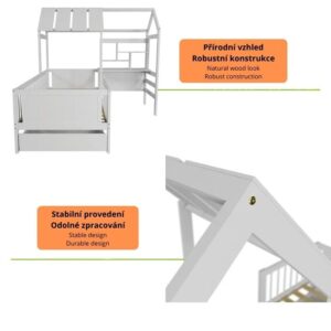 Kvalitní materiály jako borovice, MDF a překližka zajišťují pevnost a stabilitu. Postel je navržena s důrazem na bezpečnost a snadnou údržbu. Montáž je jednoduchá a zvládne ji každý rodič podle přiloženého návodu.