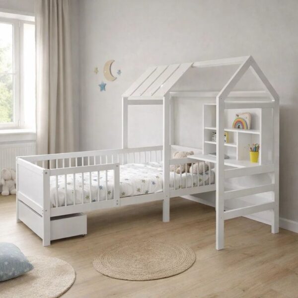 Bílá dětská postel okouzlí každé dítě i rodiče svým originálním domečkovým vzhledem. Vytváří bezpečné a inspirativní místo pro hraní, odpočinek i učení. Praktické zásuvky a psací stůl umožní dětem mít vše potřebné po ruce a zároveň udržet pořádek v pokoji.