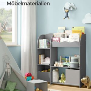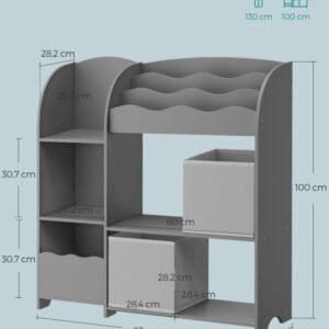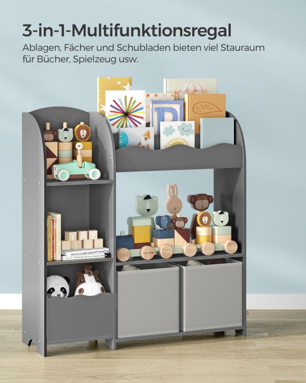 Udržet dětský pokoj uklizený nemusí být boj. Tento praktický regál kombinuje police na knihy, přihrádky na hračky a dva vyjímatelné boxy, díky kterým má každá věc své místo. Elegantní šedé provedení snadno zapadne do dětského pokoje, herny i obývacího prostoru. Díky promyšlenému členění si dítě snadno samo uklidí své oblíbené knížky, stavebnice i plyšáky.