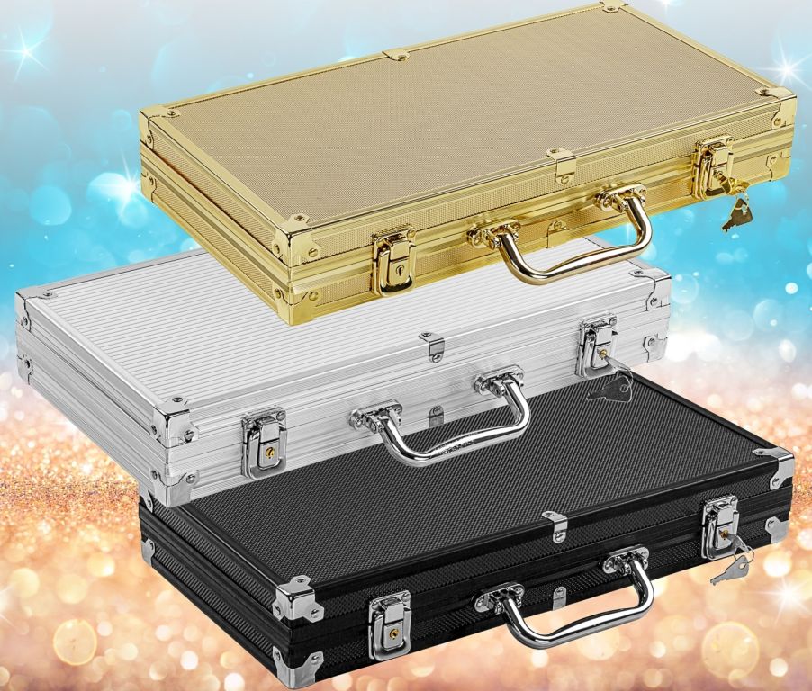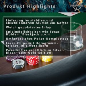 Sada obsahuje oproti běžným pokerovým setům pravé 100% plastové karty, které se používají při pokerových turnajích. Tyto karty mají nejen dlouhou životnost a kloužou po stole lépe než papírové karty, ale jsou také omyvatelné. Na žetonech Vás zaujmou nálepky s hologramy, které mění svůj vzhled při různém dopadu světla. Žetony váží 12 gramů (mají kovové jádro) a vy máte pocit, že hrajete s opravdovými žetony v kasinu. Kufřík dále obsahuje 2 balíčky karet, 5 kostek a dealer button. Tato sada tedy zahrnuje vše, co budete pro váš pokerový turnaj potřebovat.