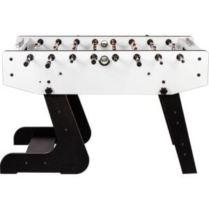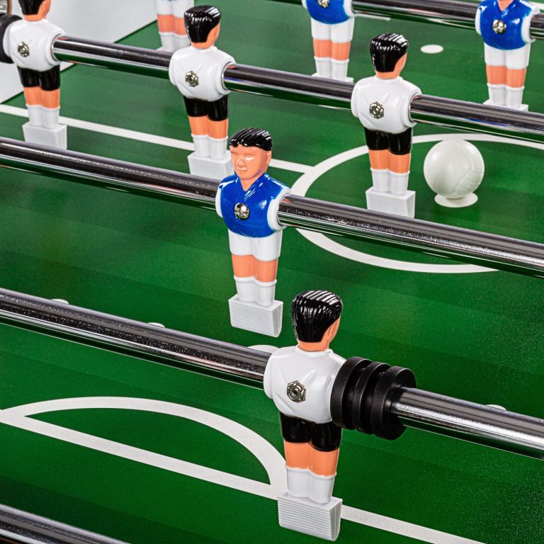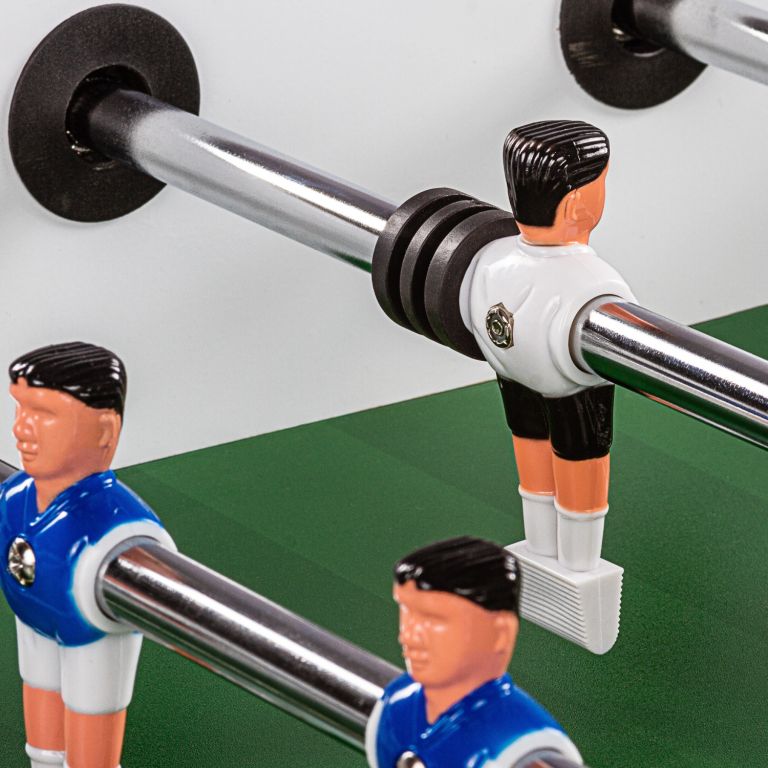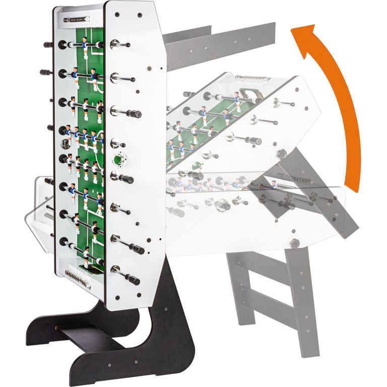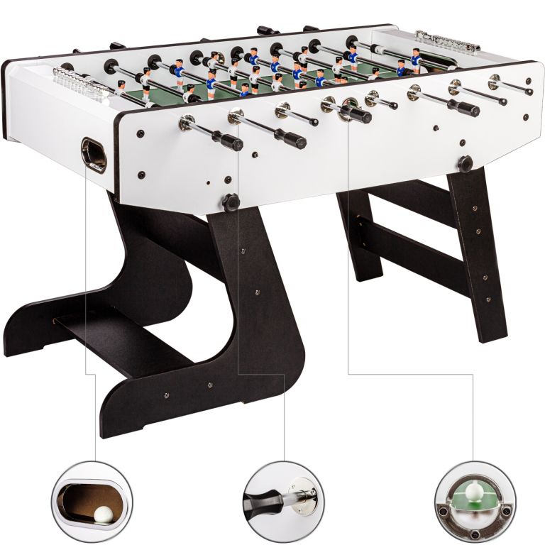 Hlavním rysem stolního fotbálku je skládací mechanismus, pomocí kterého lze stolní fotbal prakticky všude úsporně uložit. Speciální stabilitu zajišťují stabilizační tyče pod hracím polem a křížové výztuhy na nohou. Díky kvalitním protiskluzovým a ergonomicky tvarovanými držadly je ovládání míče hračka. Hladce zvednuté rohy zajistí hladký průběh míče, který Vám nikdy nezůstane v rozích. Figurky jsou šroubované a malované v barvách modrá / bílá a černá / bílá. Pomocí montážních pokynů je fotbalový stůl snadno a rychle postaven a připraven ke hře. Uložení tyčí je skrze chromovaná kluzná ložiska, která jsou robustnější a odolnější vůči opotřebí.