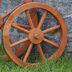 Dřevěné rustikální kolo jako dekorace do Vaší zahrady.