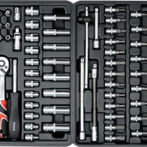 Gola sada 1/4″ obsahuje 56ks: nástavců, prodlužovacích nástavců, ráčnu s plastovou rukojetí a další příslušenství. Vyrobené z kvalitní oceli CrV50BV30, CrV40, CrV6150, CrMo440 a S2 s funkcí AS-DRIVE. Ráčna má jemný 72 zubý chod. Funkce AS-DRIVE umožňuje vyvinout větší kontaktní sílu, neboť ke kontaktu se šroubem nedochází na hranách šestihranu, nýbrž v první třetině styčných ploch. Tím nedochází k poničení hlavice šroubu. Ořech mnohdy povolí i matice a šrouby již poničené. Sada je přehledně uložena v kufříku.