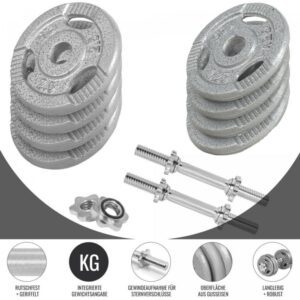 Sada se skládá z celkové hmotnosti 30 kg, kterou můžete rozdělit mezi činky. Kotouče jsou opatřeny úchopy a tak je můžete používat i pro jiná cvičení. Ať už se jedná o sklapovačky nebo speciální cviky na ramena – s úchopy máte vše pod kontrolou. Materiál kotoučů a činky je vyroben z pevné litiny.