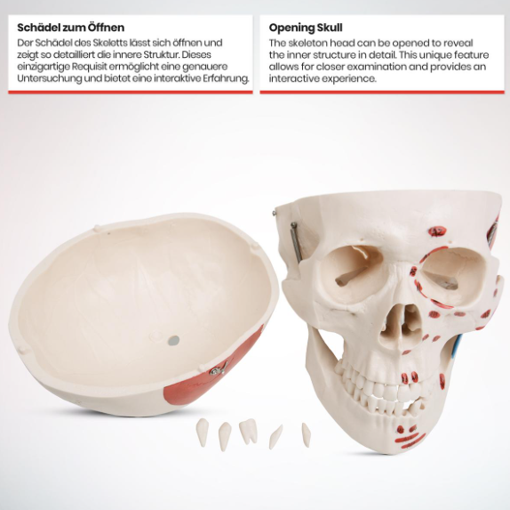 Model je vyroben z odolného PVC, snadno omyvatelný a nerozbitný. Pohyblivé končetiny, odnímatelná lebka, čelist i zuby umožňují praktickou manipulaci. Stabilní stojan s kolečky zajišťuje snadné přemístění. Montáž je jednoduchá a zvládne ji každý během pár minut.
