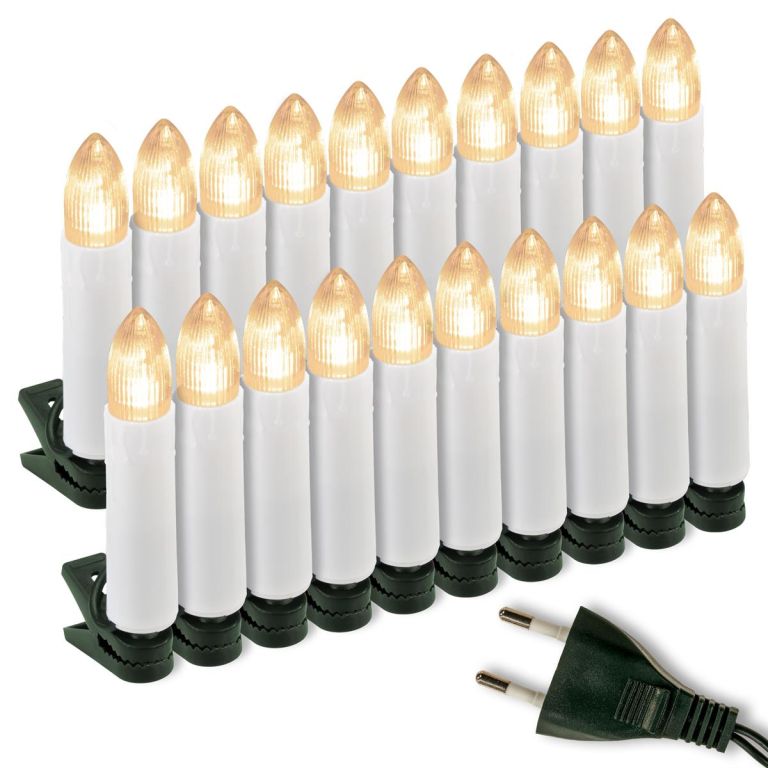 Chcete prožít Vánoce, jako když jste ještě byli dětmi? Není nic jednodušího. Použijte při zdobení vánočního stromečku tyto svíčky, které obsahují 20 LED diod a vyzařují teple bílé světlo. Na stromeček je upevníte pomocí svorek a vzdálenost mezi svíčkami je přibližně 40 cm. Svíčky jsou vhodné pouze pro vnitřní použití!