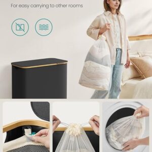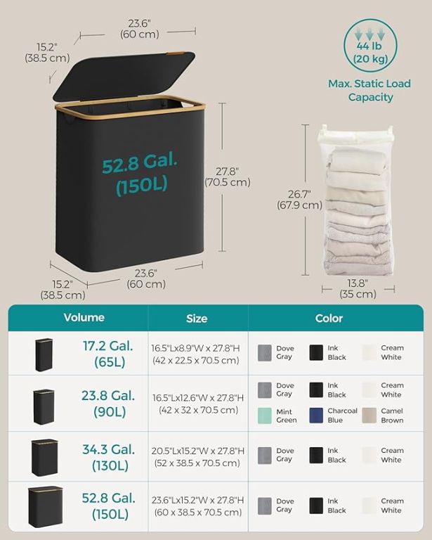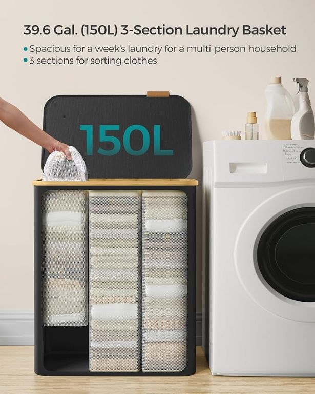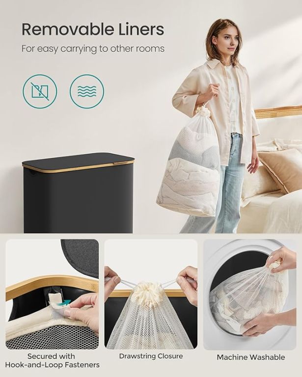 Užijte si pořádek a styl v každé domácnosti díky tomuto prostornému koši na prádlo s objemem 150 litrů. Tři oddělené přihrádky umožní snadné třídění prádla celé rodiny, zatímco elegantní černý design s bambusovým rámem vynikne v každé místnosti. Praktické víko chrání vaše soukromí a udržuje prádlo skryté před zraky i prachem.