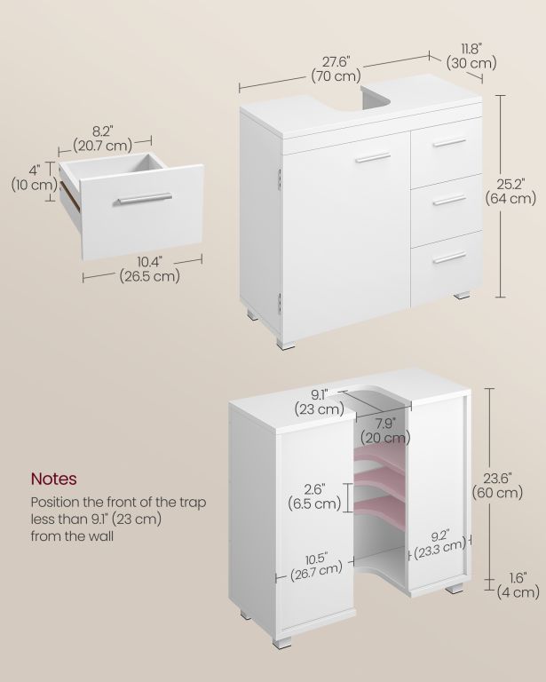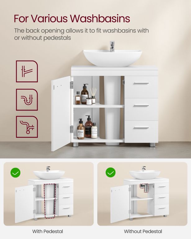 Užijte si uklizenou a harmonickou koupelnu každý den. Tato bílá skříňka pod umyvadlo nabízí dostatek prostoru pro všechny vaše potřeby. Tři zásuvky a dvě přihrádky za dvířky umožní snadné uspořádání ručníků, kosmetiky i čisticích prostředků. Elegantní design skvěle doplní každý interiér a přinese do koupelny pocit čistoty a svěžesti.