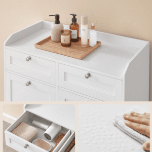 Elegantní koupelnová skříň s dvěma výklopnými koši na prádlo a dvěma zásuvkami v nadčasové barvě Cloud White přináší do vašeho domova praktické a stylové řešení úložného prostoru. V horní části skříně je dostatek místa pro kosmetiku, ručníky či dekorace, zatímco výklopné koše umožňují pohodlné třídění prádla. Díky kombinaci dřeva a textilu působí skříň moderně a útulně.