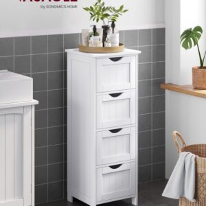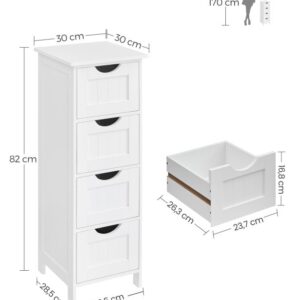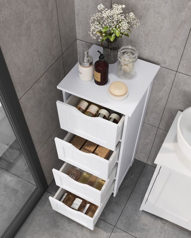 Objevte praktičnost v minimalistickém designu – koupelnová skříňka s kompaktními rozměry 30 × 30 × 82 cm je ideální volbou do menších prostor. Čtyři prostorné zásuvky pojmou kosmetiku, hygienické potřeby i drobnosti, které chcete mít vždy po ruce. Bílá barva navíc dodá vaší koupelně svěží a čistý vzhled.