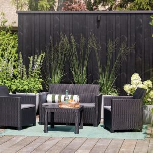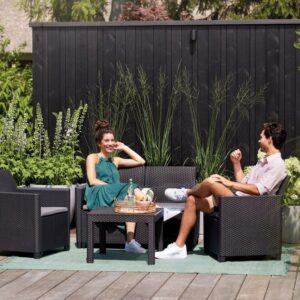 Proměňte svou terasu, balkon nebo dvorek sedací soupravou, která je vyrobena z lisovaného plastu v imitaci přírodního ratanu.