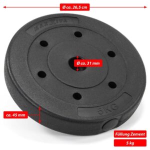 Vnitřní průměr je standardní, a proto se hodí pro všechny standardní dlouhé, krátké a loketní tyče. Zátěžové desky z cementové výplně a robustního plastového pláště. Šetrné k podlaze, šetrné k materiálu a tiché při pokládání. Závaží jsou vhodná pro všechny činky s držákem kotouče Ø 30/31 mm. Ideální do posilovny i na doma.
