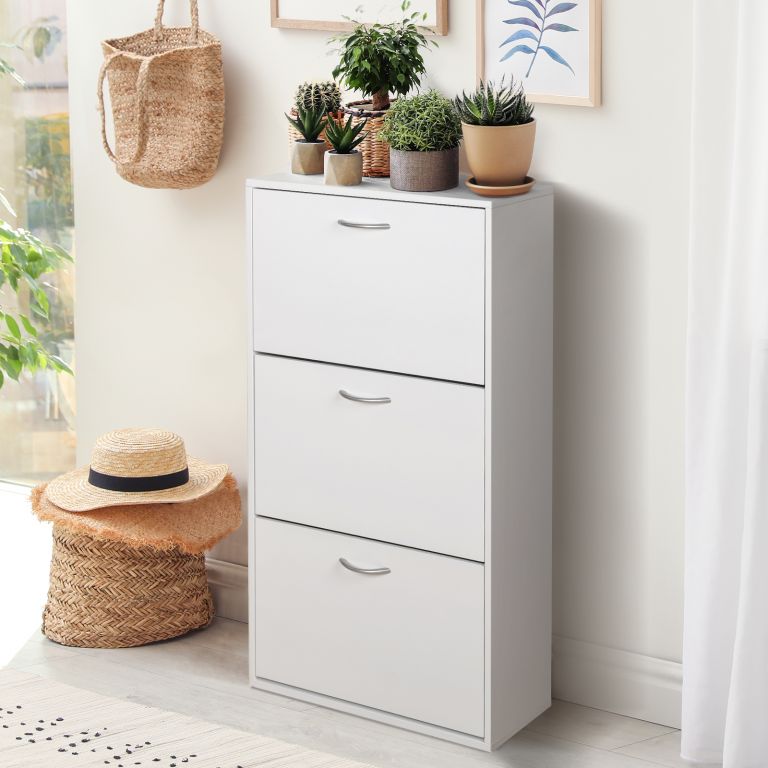 Tato skříňka na boty je ideálním doplňkem do vstupní haly, šatny a dokonce i do garáže, zejména pokud máte doma málo místa. Náš botník je vybaven výklopnými policemi, které pojmou až osmnáct párů bot. Bílé provedení se bez problémů hodí k jakémukoli interiéru. Botník je vhodný pro jakékoli boty – od tenisek, lodiček, sandálů, mokasínů až po pantofle. Tato komoda poskytuje dostatek úložného prostoru pro Vaši sbírku bot, které nosíte nejčastěji, aniž by v nich byl nepořádek. Péče o botník: otírejte pouze vlhkým hadříkem – nedoporučujeme používat chemikálie. Poznámka: Ujistěte se, že rozměr zásuvky (cca 28,5 cm) odpovídá velikosti vaší obuvi. Před nákupem botníku si boty změřte. Dekorace nejsou součástí dodávky.
