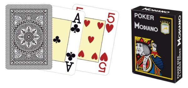 Kvalitní pokerové karty ze 100% plastu oblíbené značky Modiano. Karty mají klasický širokoúhlý formát, jsou 8,89 cm vysoké a 6,35 cm široké. Karty jsou čtyřrohé – tedy v každém rohu je uvedena hodnota karty.