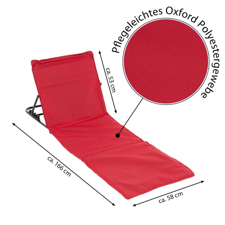 Tato plážová podložka je nezbytným doplňkem pro vaší relaxaci. Zvednuté opěradlo zajišťuje pohodlný výhled na hraní vašich dětí nebo na vaši knihu. Polstrovaný potah zajišťuje pohodlné ležení. Plážová podložka se rychle složí a lze ji snadno transportovat pomocí praktického popruhu. Ručník, kniha nebo noviny mohou být uloženy do boční kapsy se suchým zipem připevněným k zadní části.