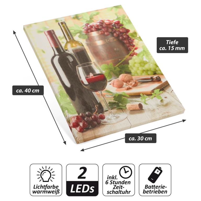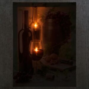 Moderně a kvalitně zpracovaná plátna jsou ve Vašem domově vždy zvláštním zpestřením a rozzáří nejen Vaše okolí. Díky motivu večera s vínem včetně LED diod s blikajícím efektem vykouzlí obraz příjemnou náladu a útulnou atmosféru. Tento motiv ve vás vyvolá chuť strávit příjemný večer se sklenkou červeného vína. Hrozny ukazují původ tohoto lahodného nápoje, který mohl přirozeně zrát v dřevěných sudech. Obraz bude ozdobou vináren, restaurací, hospod a také vaší domácí jídelny. Díky nadčasovému motivu je plátno vhodné pro každou příležitost. Díky provozu na baterie můžete nástěnnou malbu zavěsit samostatně, protože se nemusíte starat o otravný kabel.