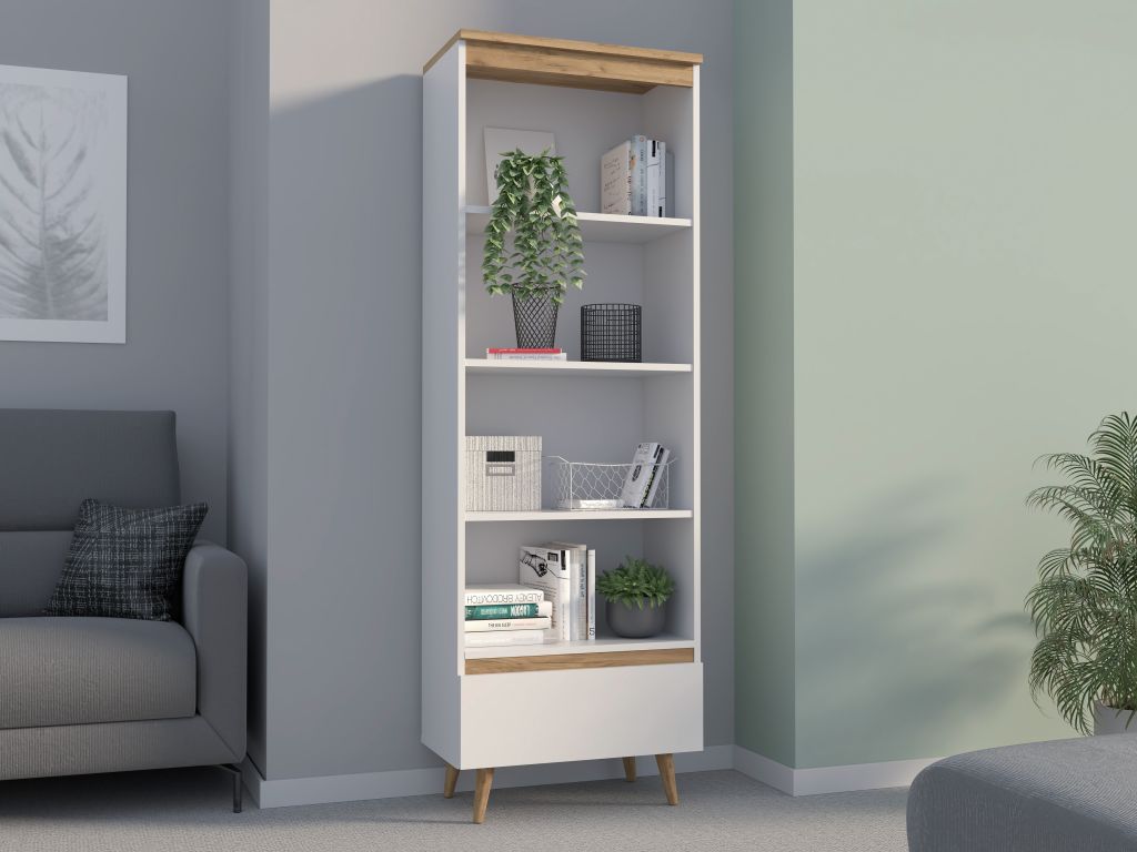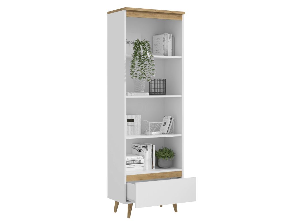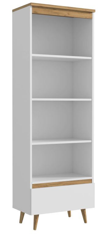 Otevřená police Nordica do pokoje. Tato elegantní police kombinuje minimalistický design s maximální funkčností. Její přední část bez úchytek a sofistikované nohy z přírodního bukového dřeva jí dodávají lehkost a skandinávský charakter.