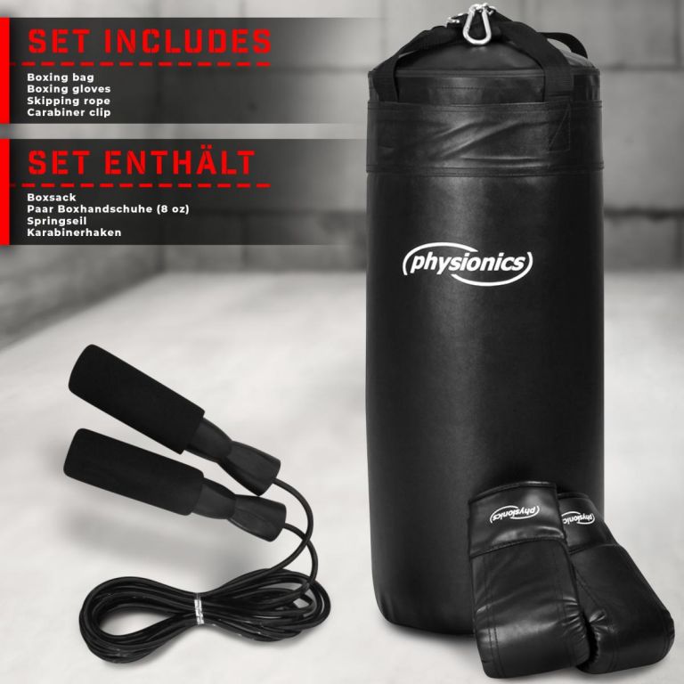 Boxovací pytel o výšce cca 70 cm a hmotnosti cca 13 kg je určen především pro děti a mládež. Textilní popruhy odolné proti roztržení (šité křížovým stehem), které drží boxovací pytel ve 4 bodech. Boxerské rukavice (velikost 8 oz.) s širokým elastickým páskem pro bezpečný úchop, zesílenými švy a všitou částí na palci pro lepší ochranu palce.