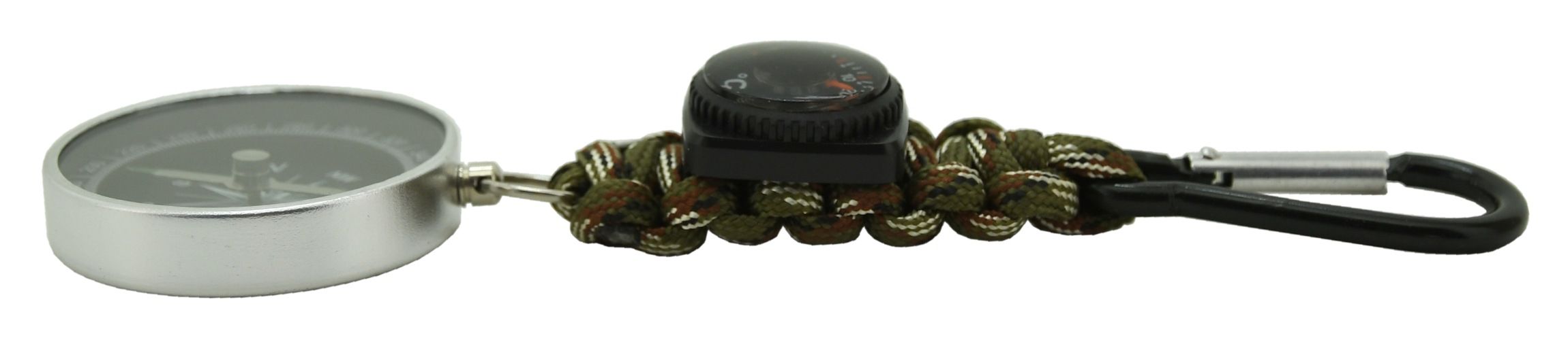 Outdoorový přívěšek s kompasem a teploměrem pro zavěšení za karabinku.