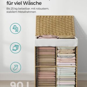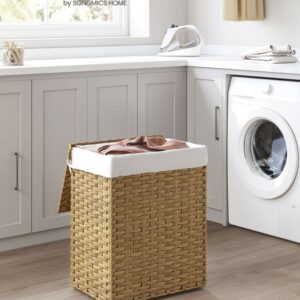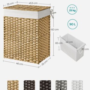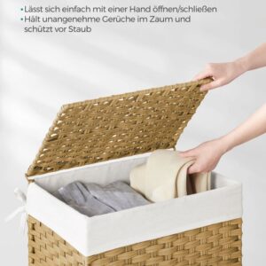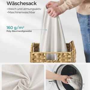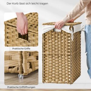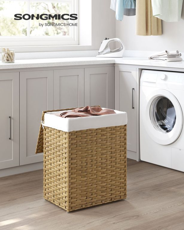 Odolná konstrukce z umělého ratanu a kovového rámu zajišťuje dlouhou životnost i ve vlhkém prostředí. Vyjímatelná bavlněná vložka umožňuje snadné přenášení prádla, zatímco silikonové nožky chrání podlahu. Montáž je rychlá a koš lze složit pro úsporu místa.