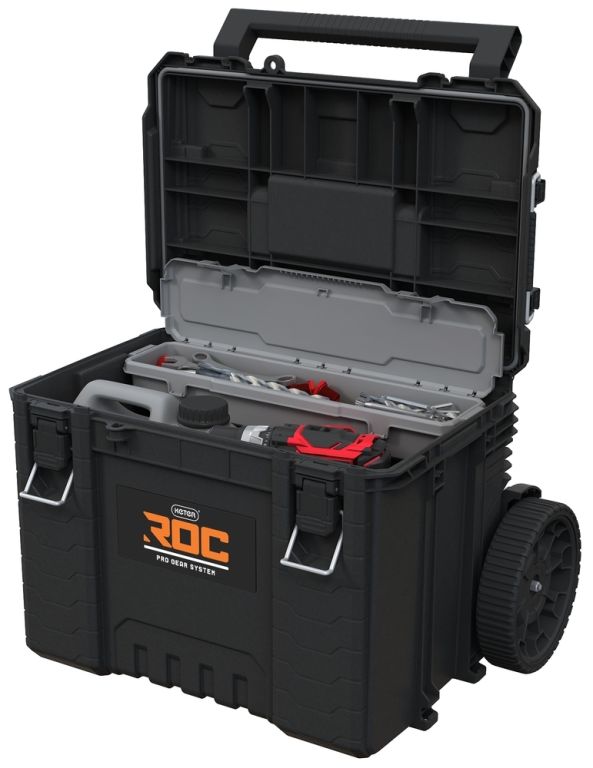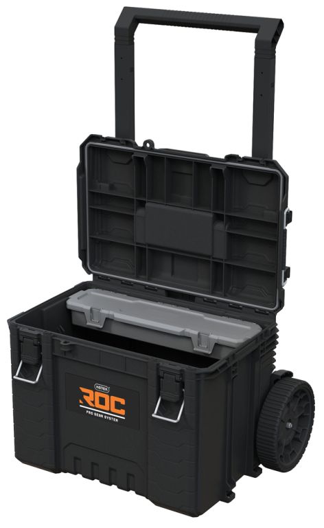 Extrémně prostorný a praktický box na kolečkách ROC Pro Gear 2.0 byl přepracován s ohledem na nejnáročnější uživatele. Vybaven inovativními řešeními, jako je odnímatelná teleskopická rukojeť s 9“ koly, která usnadňuje jak nakládání do kufru auta, tak rychlý přesun do jiného XL boxu. Box nabízí i možnost zavěšení na zeď (po odepnutí teleskopické rukojeti – bez úchytek, velikost L). Pevná konstrukce umožňuje bezpečnou přepravu těžkých nástrojů a profilovaný kryt umožňuje připojení polovičních modulů, díky čemuž je skladování nástrojů flexibilnější. Mobilní box je vyroben z nejkvalitnějšího plastu vyznačujícího se vysokou odolností proti mechanickému poškození, což zaručuje dlouhodobou životnost. Stupeň krytí IP65 zajišťuje účinnou těsnost proti vodě a prachu, díky čemuž je box ideální pro různé povětrnostní podmínky. Sada obsahuje praktický organizér s víkem, který vám umožní uspořádat šikovné nářadí a příslušenství. Funkční systém spojování boxů pomocí bočních úchytů umožňuje plnou kompatibilitu se všemi boxy z řad Pro Gear 1.0 a ROC Pro Gear 2.0 a umožňuje flexibilní přizpůsobení systému uložení nářadí individuálním potřebám. Přizpůsobte si svůj vlastní profesionální systém ukládání nástrojů s ROC Pro Gear!