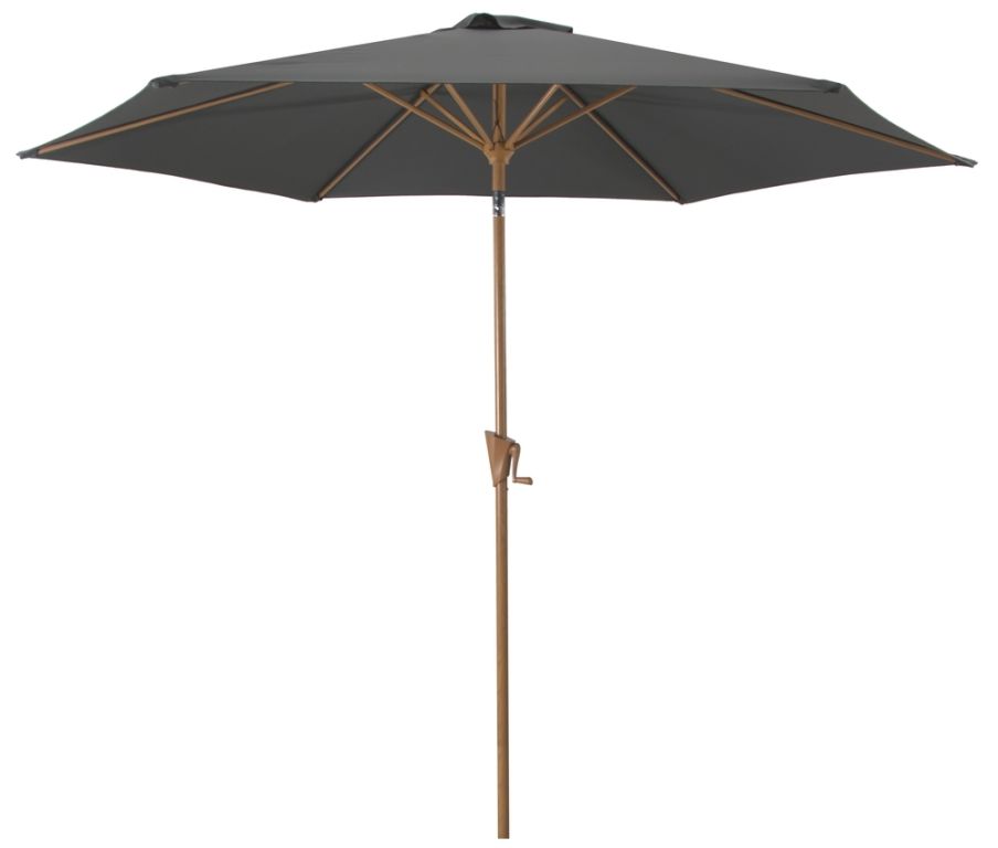 Šestiramenný naklápěcí slunečník s moderním designem a pevnou kovovou konstrukcí. Tyče v dekoru dřeva, otevírání za pomoci designové kličky, potah má vodoodpudivý nástřik, takže Vás ochrání před mírným deštěm.