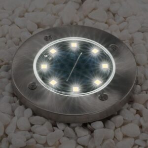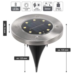 Solární bodové svítidlo s 8 LED je kulaté, bezpečné a odolné vůči povětrnostním vlivům. Horní kroužek je vyroben z nerezové oceli. Senzor automaticky zapne svítidlo za soumraku. Plně nabitý solární článek zajistí provoz po dobu přibližně 8 hodin. Během dne se integrované baterie dobíjejí prostřednictvím solárních článků pomocí solární energie. Ideální pro vjezd do garáže, chodníky, terasy nebo schůdky.