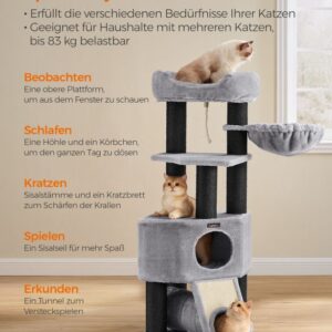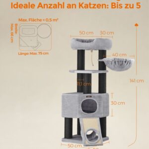 Elegantní kočičí strom nabízí vašim čtyřnohým přátelům dokonalou kombinaci komfortu, zábavy a bezpečí. Velké pelíšky potažené jemným plyšem, prostorná jeskyně i hluboký košík lákají k odpočinku a spánku. Díky svému modernímu světle šedému provedení se perfektně hodí do každého interiéru.
