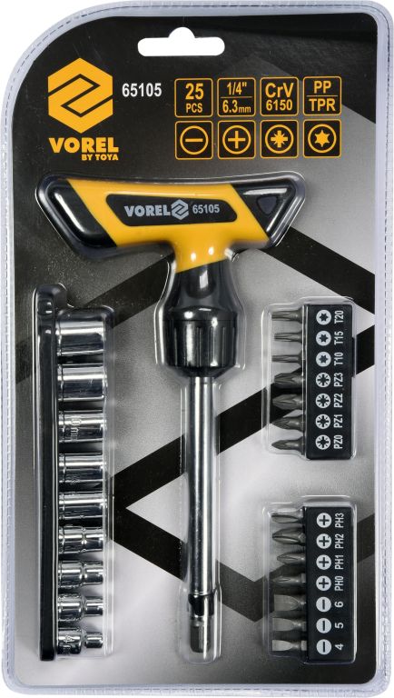Šroubovák ráčnový s příslušenstvím 25ks vyrobené z kvalitní oceli CrV 6150. Šroubovák Ergo významně usnadňuje práce, díky speciálně tvarované rukojeti. Jednotlivé bity a nástavce jsou uloženy v dílčích pouzdrech.