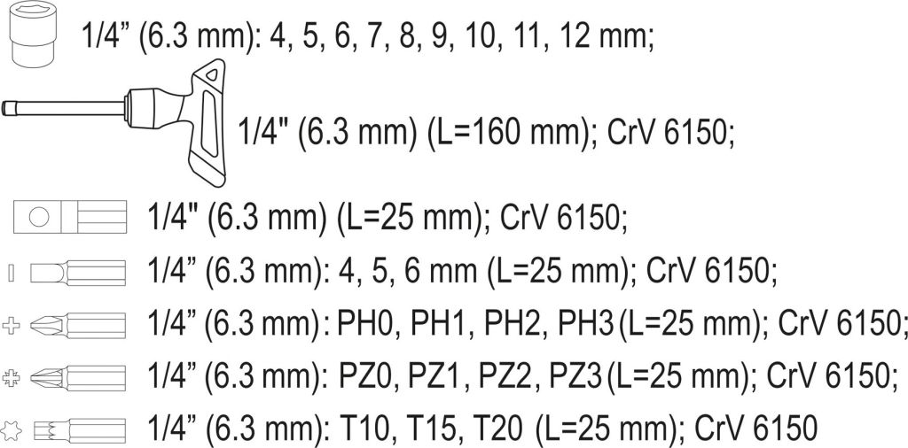- nástavec: 1/4″: 4; 5; 6; 7; 8; 9; 10; 11; 12 mm