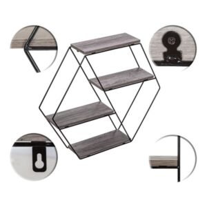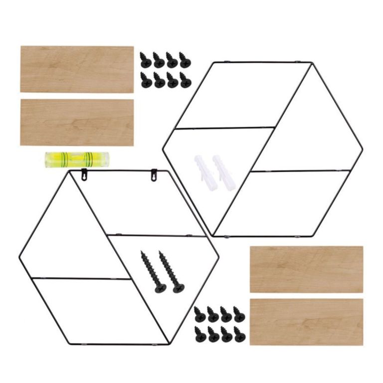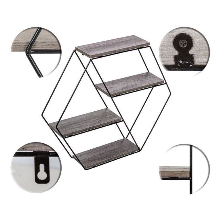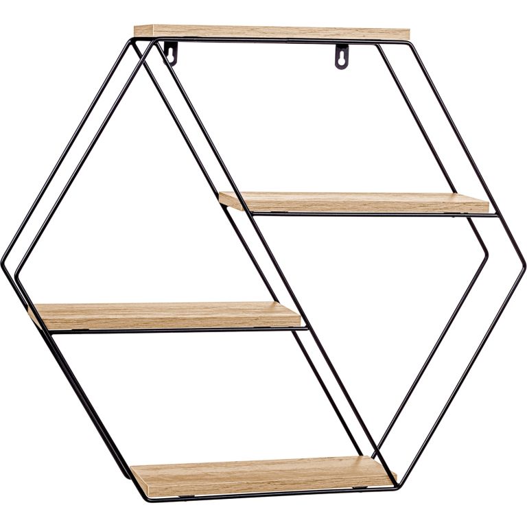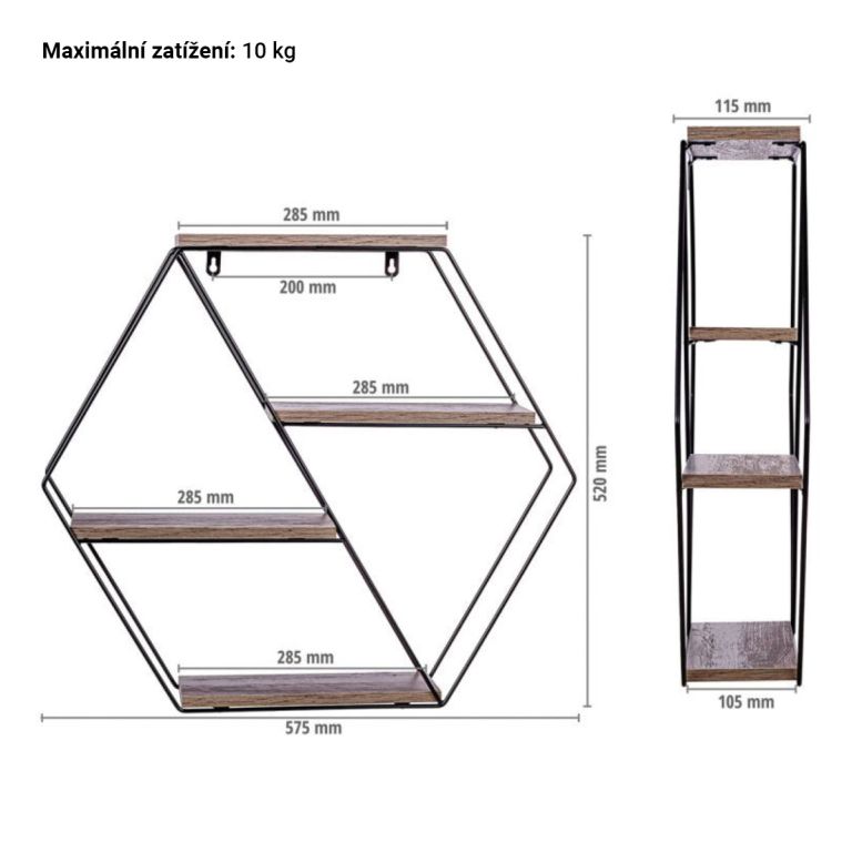 Nástěnná designová polička „hexagon” je testovaná dřevovláknitá deska MDF podle standardní dýhy E1. Kompletní police je testovaná na škodlivé látky. Díky jednoduchému rámu lze závěsnou polici dokonale kombinovat s dalším nábytkem.