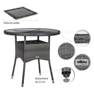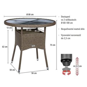 Robustní ocelová konstrukce je zabalena do polyratanového proutí odolného proti povětrnostním vlivům a UV záření, takže náš konferenční stolek je ideální pro venkovní použití. Díky předmontovaným vyrovnávacím šroubům na bistro stole lze velmi snadno vyrovnat nerovnosti podlahy. Obzvláště stabilní stolová deska ze satinovaného bezpečnostního skla.