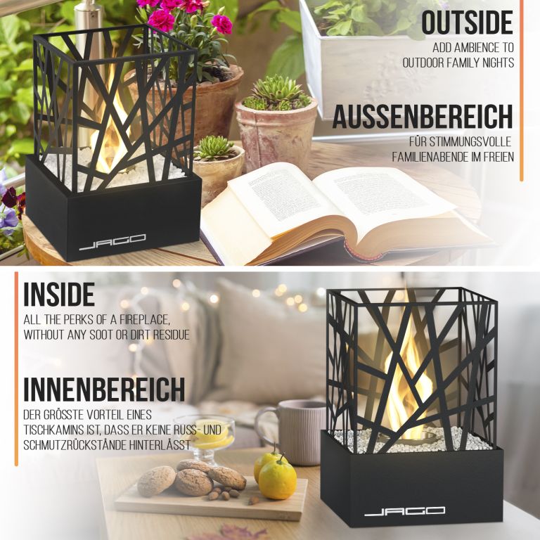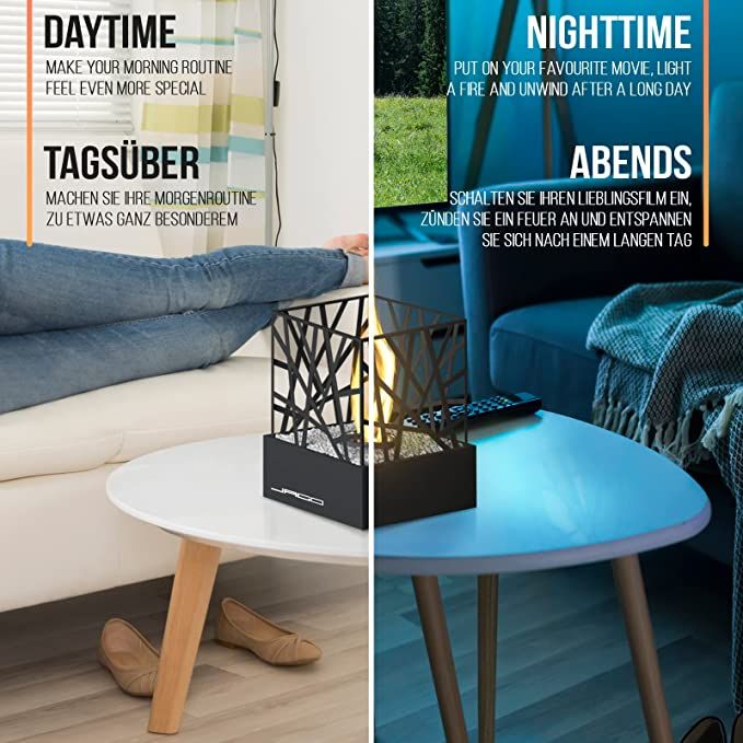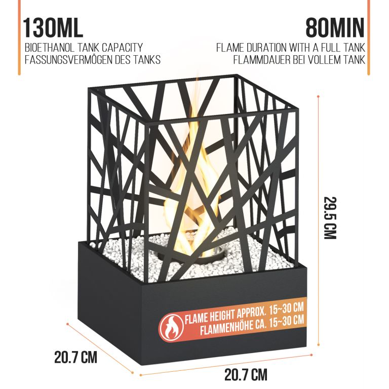 Tento exkluzivní a elegantní přenosný krb dává vašemu domácímu dekoru zvláštní kouzlo. Sestavení a použití je velmi snadné. Krb nevyžaduje žádnou instalaci ani konstrukci, např. Žádný komín, ventilace, elektrické nebo plynové připojení, aby to fungovalo. Krbová skříň, hořák z nerezové oceli a nástroj na udušení plamene (zhášeč) jsou součástí dodávky.