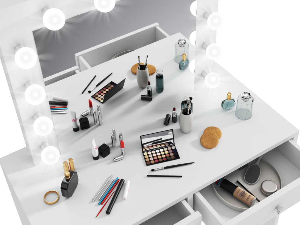 - Prostorná horní deska: poskytuje prostor pro kosmetiku, parfémy a doplňky a usnadňuje organizaci stolku.