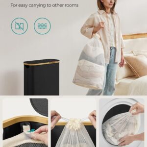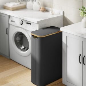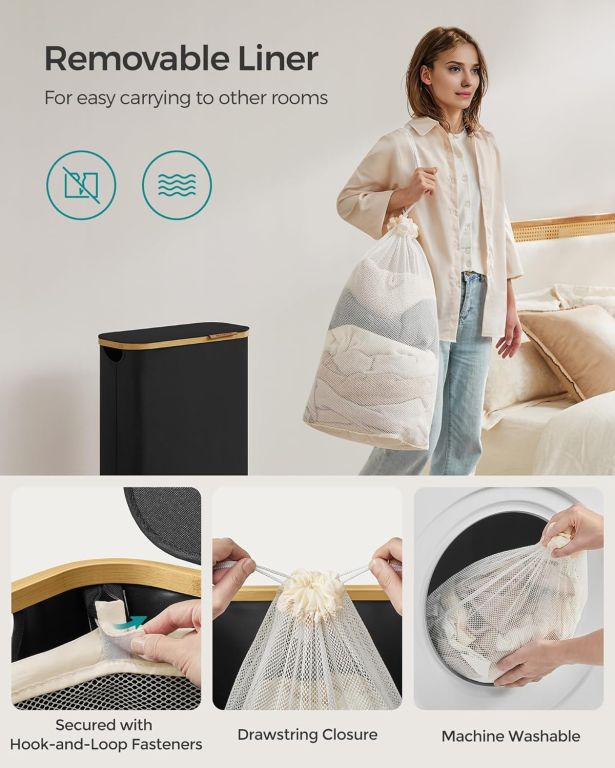Objevte elegantní řešení pro každodenní úklid prádla – tento úzký koš na prádlo se stylovým bambusovým okrajem promění i malý prostor v útulné místo. 65litrový objem nabízí dostatek místa pro celou rodinu, zatímco praktické víko chrání vaše soukromí a udržuje prádlo skryté před zraky i prachem.