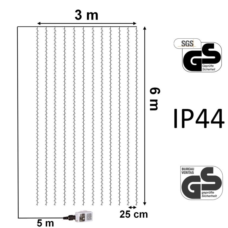 Světelný závěs je opravdu univerzálním osvětlením pro Vaši domácnost. Můžete ho umístit do okna, na dveře, mezi dveře, nebo jen tak na zeď. A co je nejlepší? Že ho nemusíte použít pouze o Vánocích, ale i kdykoliv během roku. LED diody nevytvářejí teplo nebo UV záření. Spotřeba elektrické energie je v porovnání s žárovkami extrémně nízká (až 90% úspor). Životnost LED je až 100 000 hodin a daleko přesahuje životnost normální žárovky (v závislosti na výkonu asi 1000 hodin). U světelných řetězů VOLTRONIC byla kladena nejvyšší hodnota na bezpečnost, a proto byly jak světelné řetězy (Bureau Veritas) a adaptér certifikovány (SGS) GS (testovaná bezpečnost). Součástí osvětlení je i dálkové ovládání, díky kterému osvětlení na dálku nejen zapnete a vypnete, ale zároveň můžete nastavit časovač (osvětlení bude 6 hodin poté vždy svítit a 18 hodin “spát”), nebo využít možnosti zvýšení nebo snížení jasu. Na adaptéru najdete možnost nastavení až 8 světelných funkcí: různé kombinace, svícení ve vlnách, sekvenční svícení, pomalá záře, rychlé blikání, pomalé slábnutí, jiskřivé blikání, stálé svícení.
