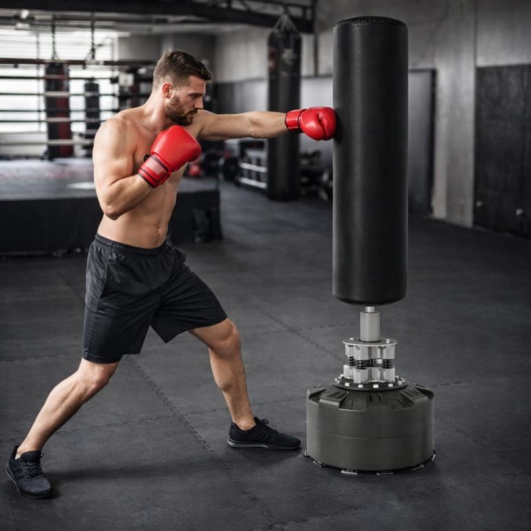 Masivní základna s 12 přísavkami a možností naplnění vodou či pískem zaručuje maximální stabilitu i při silných úderech. Pružinový mechanismus se čtyřmi ocelovými pružinami zajišťuje realistický odpor a rychlý návrat pytle do původní polohy. Boxovací pytel je ručně šitý z odolné PU kůže a nylonu, což garantuje dlouhou životnost a komfortní trénink bez nutnosti montáže na stěnu nebo strop.