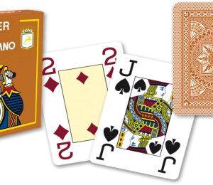 Karty mají klasický širokoúhlý formát. Karty jsou čtyřrohé - tedy v každém rohu je uvedena hodnota karty. Modiano karty jsou...