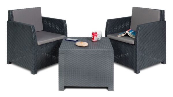 Vytvořte si oázu klidu na své zahradě s moderním setem DIANA 2 SEATERS v grafitové barvě. Pohodlná křesla s měkkými poduškami a praktický stolek s úložným prostorem vám umožní užívat si chvíle pohody na čerstvém vzduchu, ať už při ranní kávě nebo večerním posezení ve dvou.