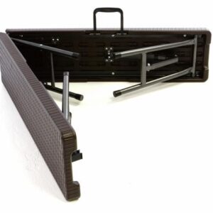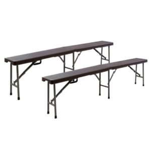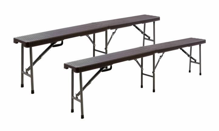 Hnědé sklopné lavice zaujmou ušlechtilým designem v ratanovém vzhledu. Lavice jsou během okamžiku postaveny. Lavice si můžete vzít sebou na jakoukoliv party, integrované přenosné držadlo umožňuje snadný transport. Materiál je nenáročný na údržbu a snadno omyvatelný. Je vhodný jak pro vnitřní tak i venkovní prostory. Nohy lavic jsou zakončeny gumovou záslepkou.