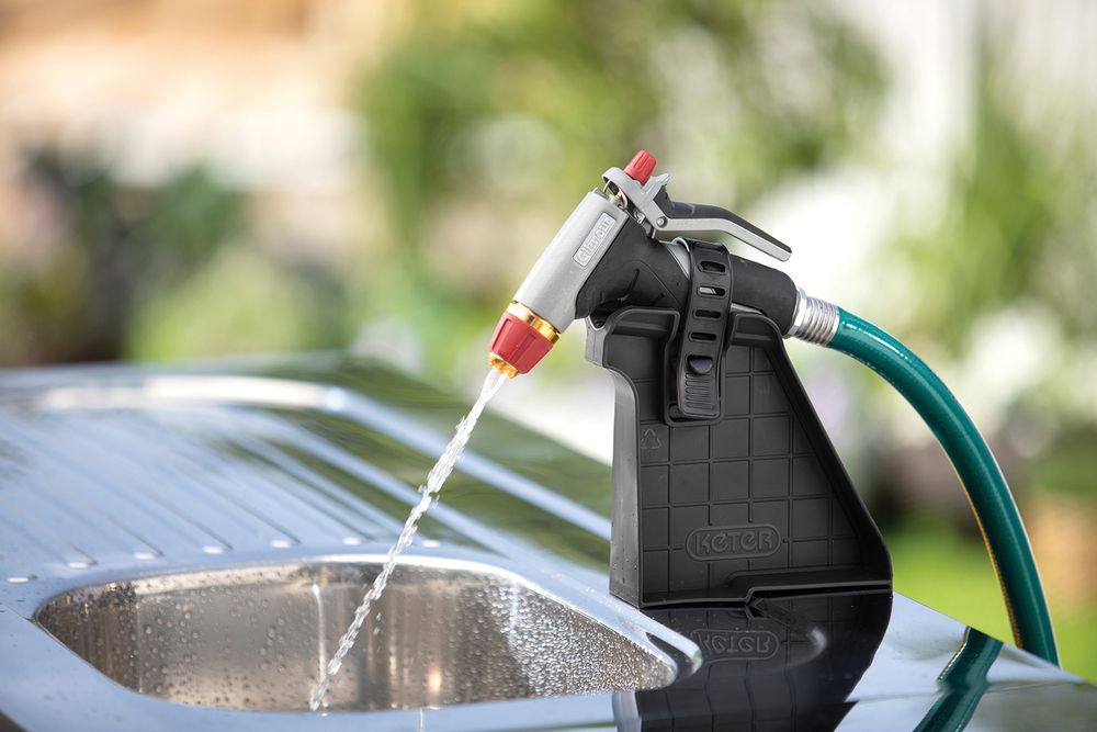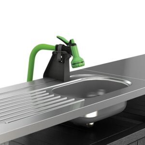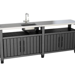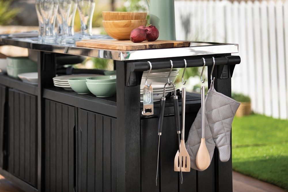 Dvě prostorné skříňe s dvojitými dveřmi vybavené dlouhou funkční nerezovou deskou a praktickou rukojetí s háčkem na ručníky, bude dobře fungovat při důležitých rodinných setkáních na terase nebo na zahradě.