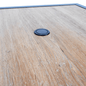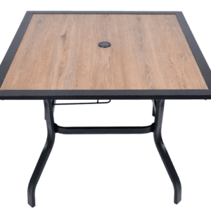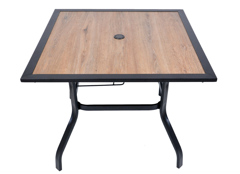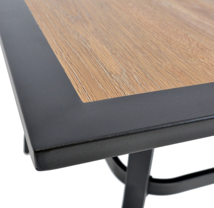 Odolný kovový zahradní stůl. Ocelová konstrukce stolu nabízí dostatečnou stabilitu. 5 mm silná stolová deska z polywoodu v dekoru dřeva poskytuje dostatečný, rovný povrch ke stolování. Konstrukce je lakovaná černou práškovou barvou. Výborně se kombinuje se všemi typy kovového zahradního nábytku. Je lehce udržovatelný a omyvatelný.